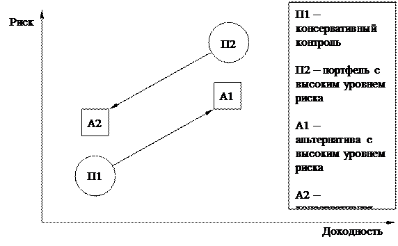 Активные участники фондовых рынков оценивают риск индивидуальных проектов в контексте их соотношения с рисками других инвестиций. Организация, которая уже имеет отдельные проекты с высокими рисками, не хочет брать другие высокорисковые проекты. И наоборот: организация с безопасными, но низкоприбыльными проектами может быть заинтересована в высокодоходных инвестициях с более высоким уровнем риска. Поэтому основой оценки должен быть весь портфель решений организации (рис. 72).