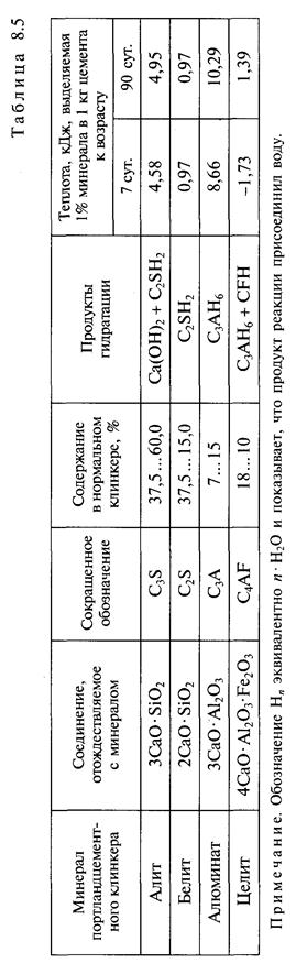 Процессы, происходящие при твердении портландцемента. Минералогический состав портландцементного клинкера представлен четырьмя индивидуальными веществами (минералами), условно названными алитом, белитом, алюминатом и цели-том. По химическому составу они близки соответственно к трех-кальциевому силикату, двухкальциевому силикату, трехкальцие-вому алюминату, четырехкальциевому алюмоферриту и в целях упрощения отождествляются с ними (табл. 8.5).