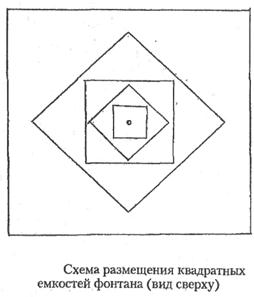 В центре водоема в форме пирамиды в несколько рядов размещены плоские декоративные емкости. Вода при помощи насоса поднимается вверх. Специальная насадка придает ей форму колокола. Собираясь в верхней емкости, венчающей вершину, она плавно перетекает ярусами сверху вниз и стекает в водоем. Форма емкостей может быть различной, как и материал, из которого они из» готовлены. Наиболее часто встречаются круглые и квадратные формы. Интересно, выглядят квадратные промежуточные водоемы, развернутые через один в горизонтальной плоскости на 90°.