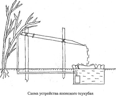 Для его устройства необходимо несколько бамбуковых палок и природных камней, водяной насос малой мощности, труба или кусок шланга и небольшой, скрытый водоем. Вода, поступая при помощи насоса по трубе или шлангу, подсоединенному к полой бамбуковой палке, тоненькой струйкой стекает на камень. Растекаясь по нему, ипопадает обратно в водоем.