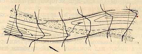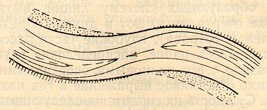 где m - масса частицы; v - продольная скорость движения частицы; R - радиус кривизны. На рис 7а эта сила изображена в виде вектора, направленного в сторону вогнутого берега. Под действием этой силы частица будет устремляться к вогнутому берегу.