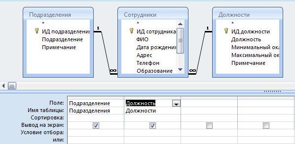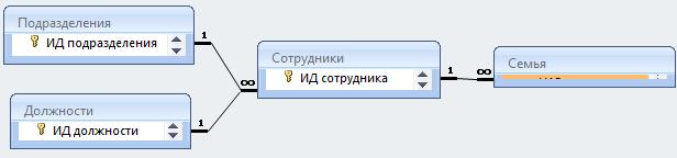 Рассмотрим примеры запросов к БД «Отдел кадров», схема данных БД представлена ниже: