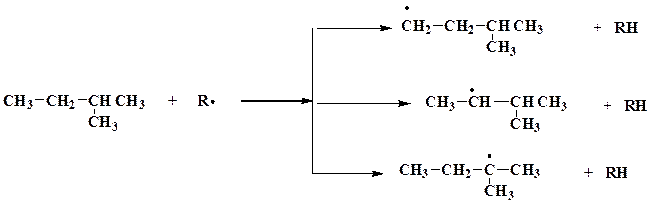 Монозамещение атома водорода протекает, преимущественно у третичного углерода, если такового в структуре алкана нет, тогда у вторичного углерода; так как в этом случае образуются наиболее устойчивые промежуточные частицы (радикалы).