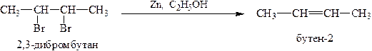 4. Из вицинальных дигалогенпроизводных алканов (содержащих атомы галогена у соседних атомов углерода) путём отщепления двух атомов галогена с помощью активного металла (Zn, Mg) нагреванием в спиртовой среде: