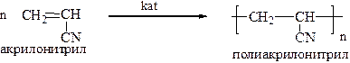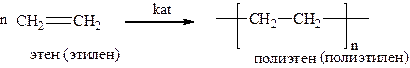 3. Полимеризация – образование полимерной молекулы под действием различных катализаторов. При написании схемы реакции обычно справа указывают элементарное звено полимера в квадратных скобках, тот остаток от мономера, который многократно повторяется в полимерной цепи.