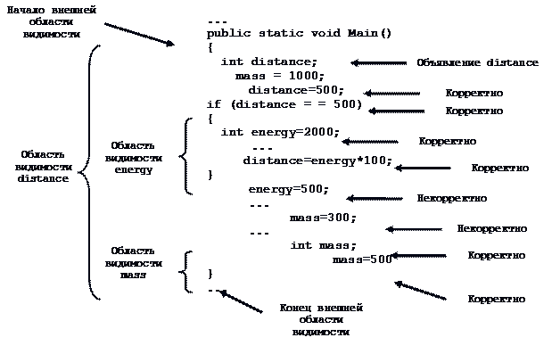 Действие этих правил иллюстрирует следующий рисунок. Здесь показаны два блока кода: один принадлежит методу Main(), а другой (размешенный внутри Main() — оператору if). Поскольку переменная distance объявлена в начале внешней области видимости, она доступна во всем блоке Main(), включая и код внутреннего блока оператора if.Переменная mass объявлена ближе к окончанию метода Main(). поэтому она доступна в относительно небольшом сегменте кода, между ее объявлением и окончанием области видимости Main(). Переменная energy объявлена внутри блока if и доступна лишь внутри него.