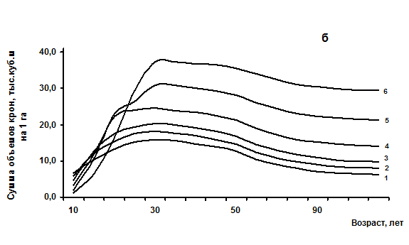 Открытый для площадных показателей закон проявляет себя аналогичным образом в показателях объема. С некоторым запаздыванием по сравнению с сомкнутостью (на 10 – 25 лет) древостои точно также достигают предельного состояния по сумме объемов крон и имеют индивидуальные линии своего развития по этому показателю в зависимости от начальной густоты (рис 1). Впечатляют полученные различия в суммах объемов крон, достигающие 3-5 раз. Это приводят к различиям в объемах фотосинтезирующего аппарата, что обуславливает и разную производительность древостоев на таких линиях развития.