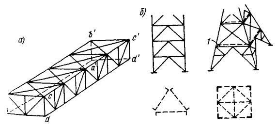 пространственный брус в поперечном сечении замкнут, он обладает большой жесткостью при кручении и изгибе в поперечном направлении, поэтому потеря его общей устойчивости невозможна. Конструкции мостов, кранов, башен, мачт и т.п. представляют собой также пространственные брусья, состоящие из ферм (рис.9.8, б).
