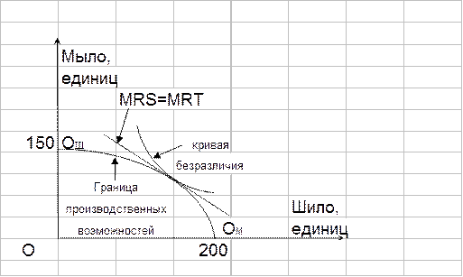 Предельная норма трансформации MRT шила на мыло равна тангенсу угла наклона касательной к данной точке кривой производственных возможностей. По мере роста производства мыла MRT возрастает. Это означает рост альтернативных издержек: все труднее переместить ресурсы из производства шил в производство мыла. MRT МШ=-- Ш / М