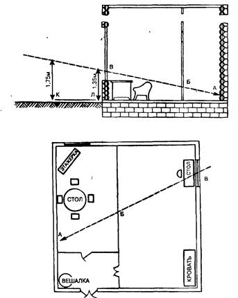 А – место обнаружения пули, Б – пулевые пробоины в перегородке, В – входные пробоины в окне, ВА – линия полета пули, КЛ – участок, откуда мог быть произведен выстрел