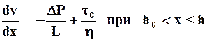 Система уравнений упрощается до одного уравнения (2h0 - жёсткое ядро потока, см. рис.7, стр.43. Характерный вид профиля скорости в щели при течении неньютоновской жидкости Шведова-Бингама):