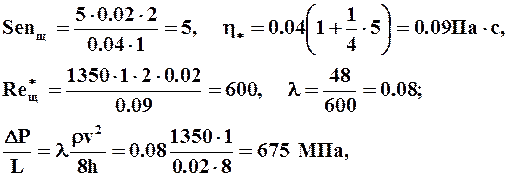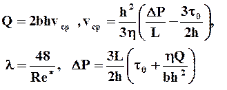 - обобщённый параметр Рейнольдса; h* = h (1+ 1/4Senщ) - приведённая вязкость жидкости Шведова - Бингама; Senщ = t02h/hvср - параметр Сен - Венана для плоской щели.