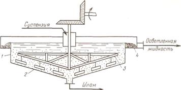 | 1-корпус; 2-днище; 3-гребковая мешалка; 4-кольцевой желоб Рисунок 4.40 - Отстойник непрерывного действия с гребковой мешалкой |