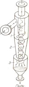 Циклон состоит из цилиндрического корпуса 1с коническим днищем 2. Запыленный газ вводится в корпус 1через тангенциальный патрубок 4 прямоугольного сечения со скоростью 20-30 м/с и вращается в кольцевом зазоре, образованном центральной трубой для вывода очищенного газа 2 и корпусом аппарата 1. Благодаря тангенциальному вводу он приобретает вращательное движение вокруг трубы для вывода очищенного газа, расположенной по оси аппарата. Частицы пыли под действием центробежной силы отбрасываются к стенкам корпуса. В аппарате создаются два спиральных потока: внешний поток запыленного газа, который движется вниз вдоль поверхности стенок циклона, и внутренний поток очищенного газа, который поднимается вверх, располагаясь вблизи оси аппарата, и удаляется из него. Пыль концентрируется вблизи стенок и переносится потоком в разгрузочный бункер 5.