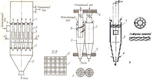 Используют также мультициклоны (батарейный циклон), состоящие из большого количества циклонных элементов.