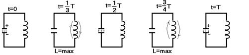 Начиная с этого момента времени в течении второй четверти периода, ток в контуре начинает убывать. Убывающий ток свои магнитным полем в катушке наводит ЭДС самоиндукции которая поддерживает убывающий ток. В результате конденсатор перезаряжается к одной второй периода конденсатор полностью перезарядится и энергия магнитного поля катушки перейдет в энергию электрического поля конденсатора. Во второй половине периода процессы в контуре полностью повторяется, только в обратном порядке.