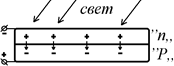 На поверхность проводника с проводимостью типа “P,, методом напыления наносится тонкий слой полупроводника с проводимостью типа “n,,. Толщина этого слоя измеряется микронами. Между полупроводниками с разным типом проводимости образуется электронно-дырочный переход с электрическим полем. В целом верхний и нижний слои фотоэлементов электронейтральны.