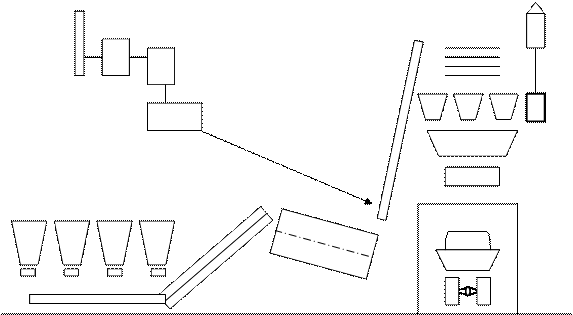Из сушильного барабана горячие материалы поступают по ссыпному потоку в горячий элеватор и поднимаются в сжигательный агрегат. Грохот разделяет горячие материалы по фракциям (по количеству сит) и поступают в расходные емкости. Отсеки снабжены автоматическими управляемыми затворами которые подают материал в дозатор. Отдозированные материалы поступают в смеситель. Параллельно с этим происходит объемное дозирование битума.