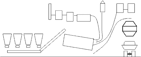 Строго фракционные материалы транспортером или фронтальным погрузчиком подаются в бункеры агрегата питания 1, в котором осуществляется весовое дозирование с учетом влажности поступающих материалов 2. Отдозированные материалы сборным транспортером 3 подаются в сушильно-смесительный барабан 4. Отличия этого барабана в том, что у него большая длина (в 1,5 раза). Расположение поточного агрегата со стороны входного загрузочного торца. Движение материала и горячих газов в одном направлении (поточная) сушка. Материалы просушиваются до рабочей температуры и переходят во вторую смесительную камеру. Битум поступает в начальную зону барабана и при вращении его смешивается с нагретым минеральным материалом. Сюда же подается и отдозированный минеральный порошок. Готовая смесь поступает в промежуточный бункер и далее скиповым подъемником в накопительный бункер.