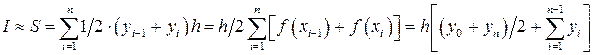 по двум граничным точкам на каждом элементарном отрезке. Интеграл представляет собой сумму площадей элементарных трапеций: