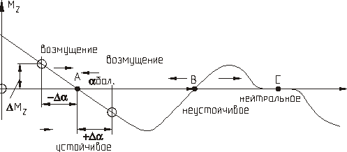 - частная производная отрицательна, то при ∆α>0 возникает пикирующий момент ∆Mz <0, и при ∆α <0 – кабрирующий момент ∆Mz >0 (рис. 54 б), направленный на возвращение ЛА в исходный режим движения.