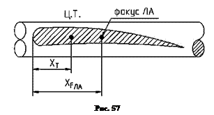 ,зависящая от тяги работающего двигателя, обычно невелика и приближенно можно считать, что фокус ЛА по углу атаки (или кратко «фокус ЛА») представляет собой точку на продольной оси приложения приращения подъемной силы, обусловленной изменением угла атаки, т.е. точку, относительно которой момент тангажа остается постоянным при изменениях