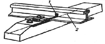 Рис. 3.1 "Маячная" шпала для контроля угона пути: 1- риска; 2- линия совмещения риски с кромкой подкладки