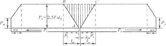 Рис. 4.1. Расчетная схема определения зазора в месте разрыва рельсовой плети: Pt — продольная температурная сила; Рп — сопротивлении продольному перемещению рельса в накладках; F— площадь поперечного сечения рельса; ∆tu — интервал понижения температуры (относительно нейтральной) к моменту разрыва рельсовой плети;