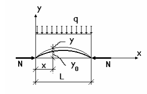 Выбор граничных условий. Как показывают исследования ВНИИЖТа и практика эксплуатации бесстыкового пути, при выбросе рельсо-шпальная решетка изгибается в виде трех-пяти полуволн, причем наибольшей является средняя полуволна, которая и определяет характер выброса. В точках перегиба кривой изгибающие моменты равны нулю. Это является основанием для принятия следующей расчетной схемы: слабо искривленный стержень длиной L и начальной стрелой изгиба уо,шарнирными опорами на концах, нагружен сжимающей продольной силой N, вызванной повышением температуры t рельсов. Перпендикулярно линии действия сжимающей силы действуют силы сопротивления q, распределенные по длине стержня. Описанная расчетная схема при рассмотрении условий равновесия большой полуволны изогнутого стержня приведена на рисунке 5.1.