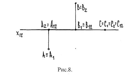 У т.А горизонт. пр-ия А1 совпадает с т.А (А≡А1). Фронт. пр-ия совпадает с осью Х12 (А2≡А12). Точку В, расположенную на фронт. плоскости проекций: В≡В2. Точка С одновременно Î и плоскости π1 и π2.