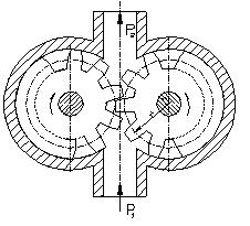 Шестеренные насосы получили широкое распространение для подачи масел в системы гидропривода, а также для перекачивания смазочных материалов. Наиболее широко применяются насосы с шестернями внешнего зацепления. На рис. 6.5 приведена схема такого насоса. Он состоит из двух одинаковых шестерен ведущей и ведомой, установленных в корпусе с минимальными зазорами. Шестерни вращаются навстречу другу. При вращении шестерен жидкость заполняет впадины и переносится из полости всасывания в полость нагнетания и далее, при вступлении зубьев в зацепление, вытесняется в напорное окно.