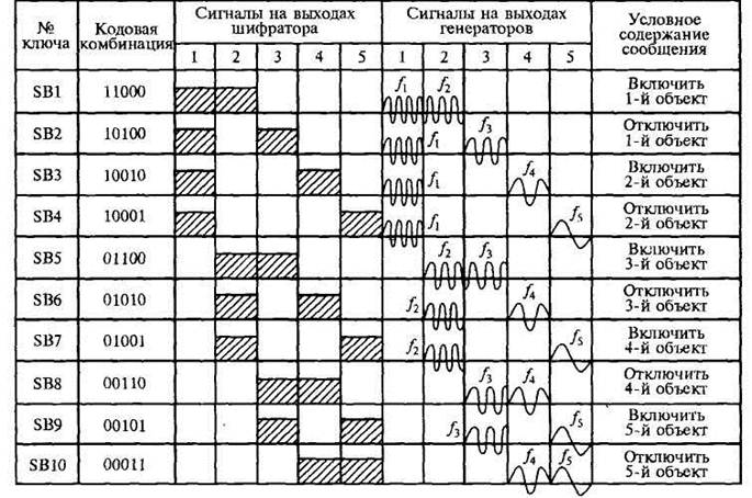 Аналогичным образом можно осуществлять включение и отключение других объектов. Общее количество сообщений (команд), которые можно передать, пользуясь данной системой, соответствует числу частотных каналов N. За одну передачу можно передать все необходимые сообщения, предварительно набрав их нажатием определенных кнопок.