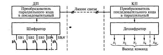 Кодовое избирание широко используется в системах с временным разделением элементов сигнала (рис. 6.14). В такой системе кодовая комбинация параллельного кода на выходе шифратора с помощью преобразователя, на который она поступает, преобразуется в соответствующую комбинацию последовательного кода. Все ее элементы поступают в линию связи поочередно во времени. На КП с помощью преобразователя происходит обратное преобразование последовательного кода в параллельный. Комбинация параллельного кода поступает на дешифратор, на одном из выходов которого Xj—Хдг появляется передаваемая команда.