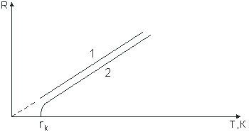 Качественная температурная зависимость сопротивления металла представлена на рис.27 (кривая 1). Впоследствии было обнаружено, что сопротивление многих металлов (например Al, Pb, Zn и др.) и их сплавов при очень низких температурах Т (0,14-20 К), называемых к р и т и ч е с к и м и, характерных для каждого вещества, скачкообразно уменьшается до нуля (кривая 2), т.е. металл становится абсолютным проводником.