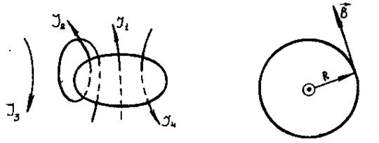 где n - число проводников с током, охватываемых контуром L произвольной формы. Каждый ток учитывается столько раз, сколько раз он охватывается контуром. Положительным считается ток, направление которого связано с направлением обхода по контуру правилом правого вита, ток противоположного на правления считается отри нательным. Например, для системы токов, изображенных на рис. 42,