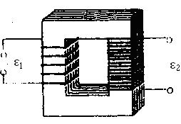 Рис. 55 | Принципиальная схема трансформатора показана на рис.55. Первичная и вторичная катушки (обмотки), имеющие соответственно N1 и N2 витков укреплены на замкнутом железном сердечнике. Так как концы первичной обмотки присоединены к источнику переменного напряжения с э.д.с ε1, то в ней возникает переменный ток І1, создающий в сердечнике трансфор- |