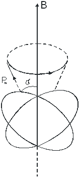 Рис. 57 | Ради простоты предположим, что электрон в атоме движется по круговой орбите. Если орбита электрона ориентирована относительно вектора произвольным образом, составляя с ним угол а (рис. 57), то можно доказать, что она приходит в такое движение вокруг В, при котором вектор магнит ного момента Рш, сохраняя постоянным угол а, вращается вокруг направления В с некоторой угловой скоростью. Такое движение в механике называется прецессией. Прецессию вокруг вертикальной оси, проходящей через точку опоры, совершает, например, диск волчка при замедлении движения. Таким образом, электронные орбиты атома под действием магнитного поля совершают прецессионное движение, которое эквивалентно круговому току. Так как этот микроток индуцирован внешним магнитным полем, то, согласно правилу Ленца, у атома появляется |