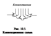 Конвекционная схема (рис. 10.5) – обмен воздуха в карьере происходит за счет восходящих потоков воздуха, возникающих за счет притока тепла, например, за счет окислительных процессов. Скорость потока воздуха на бортах карьера возрастает в направлении снизу вверх. При глубине карьера до 100-120 м у верхней кромки карьера обычно не превышает 1,5 м. Схема мало эффективна.
