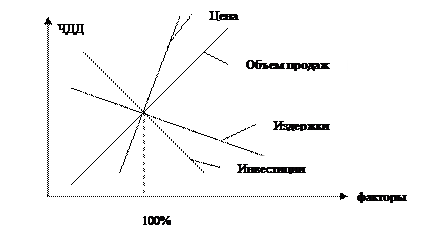 Для проведения анализа чувствительности необходимо иметь результаты расчета критериев эффективности, предпринятых в проекте значениях исходных параметров. Затем значение какого-либо параметра изменяются в большую или меньшую сторону, и рассчитывается новое значение критерия. Может быть построена диаграмма чувствительности.