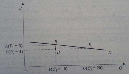 Предпринимателю всегда жизненно важно знать, что будет с его доходами, если он изменит цену на свою продукцию. Допустим, предприниматель понизил цену единицы своего продукта (с эластичным спросом) с 5 до 4 р. В результате этого объем продаж вырос с 10 до 20 ед. (см. рис). В итоге выручка фирмы возросла с 5 р. х 10 = 50 р. (площадь прямоугольника ABF0) до 4 р. х 20 = 80 р. (площадь прямоугольника CEG0).