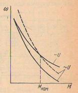Как указывалось, с целью сближения характеристик обмотку возбуждения выполняют секционированной (рис. 2.23). При работе от сети переменного тока включается меньше витков обмотки возбуждения (выводы 1 — 2), чем при питании от сети постоянного тока (выводы 3 — 4). Уменьшение числа витков обмотки возбуждения вызывает уменьшение магнитного потока и повышение угловой скорости ротора. Механическая характеристика приподнимается, не меняя своей жесткости (пунктирная линия на рис. 2.25). Соотношение чисел витков, включенных при питании от различных сетей, должно быть таким, чтобы получилось наибольшее сближение характеристик при номинальной нагрузке Мном.