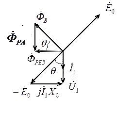 Так как электромагнитный момент М уравновешивает момент нагрузки, то при увеличении нагрузки потребление мощности из сети и, следовательно, тока I 1 возрастает. Как следует из упрощенной векторной диаграммы одной фазы СД на рис. 4.1, рост тока I 1 приведет к увеличению угла q.