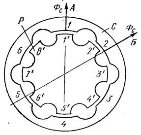 Если в данный момент времени поток ФС направлен по оси А, то реактивный вращающий момент заставит ротор повернуться в положение наибольшей магнитной проводимости, т.е. напротив статорных зубцов 1 и 4 будут находиться роторные зубцы 1΄ и 5΄. При перемещении потока ФС в положение оси Б, т.е. на угол 360°/ZС, ротор под действием реактивного момента повернется на такой угол, что магнитная проводимость снова станет наибольшей. Это произойдет тогда, когда напротив зубцов статора 2 и 5 встанут зубцы ротора 2΄ и 6΄, т.е. ротор повернется на угол 360°/ZС–360°/ZР. Следовательно, отношение угловой скорости поля статора w1 к угловой скорости ротора w2 равно