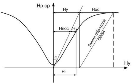 В первом квадранте сигналы ОС и управления складываются – ПОС, во втором квадранте они вычитаются – ООС, т.е. чем больше глубина ОС, тем круче идет характеристика Нр.ср = f(Ну) в первом квадранте и положе во втором квадранте.