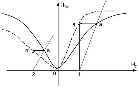 Из ряда точек по оси Ну проводят прямые, параллельные линии ПОС до пересечения в т. «а» и «в» с характеристикой вход-выход МУ без ПОС. Ординаты точек пресечения сносят на вертикали проведенные через точки 1,2 и т.д. Полученные точки «а′» и «в′» являются точками вход-выход МУ с ПОС. Это построение дает хорошее совпадение с экспериментом при Кпос ≤0,9.
