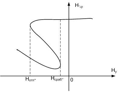 В случае, когда Wпос > Wр, т.е. Кпос>1, линия ПОС пройдет ниже характеристики Wпос = f(Ну) и перестроенная по указанному выше методике характеристика МУ с ПОС примет релейный (петлеобразный) вид, т.е. МУ входит в релейный режим и работает как бесконтактное магнитное реле (БМР), у которого значения токов Iу, соответствующих Нотп Нсраб, определяют ток отпускания Iотп и срабатывания Iсраб реле.