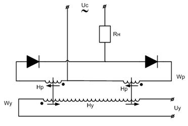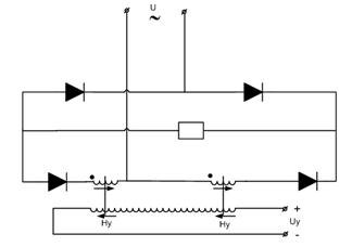 Рабочие обмотки включены параллельно, через них течет пульсирующий однополупериодный ток, постоянная составляющая которого обеспечивает самоподмагничивание МУ.