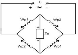 Рабочие обмотки Wр нереверсивных МУ в мостовой схеме включены в противоположные плечи моста. При подаче сигнала Iy индуктивное сопротивление Хр одной пары рабочих обмоток возрастает, а другой – падает, в результате в нагрузке Zн возникает ток.