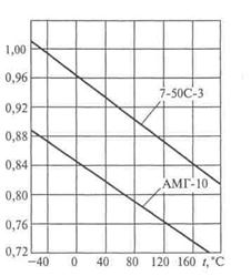 По графикам изменения плотностей масла АМГ-10 и рабочей жидкости 7-50С-3 в зависимости температуры (рис.10.1) можно определить увеличение объёма залитой в гидросистему жидкости и оценить изменение уровня жидкости в баке при нагреве. Расширение жидкости при нагреве необходимо учитывать в бaкe, когда она заперта в цилиндре гидравлическим краном, так как давление в замкнутой системе может превысить допустимые напряжения в трубопроводах и цилиндре и привести к их разрушению. Плотность гидрожидкости изменяется приблизительно на 7 % при изменении температуры на 100 °С.