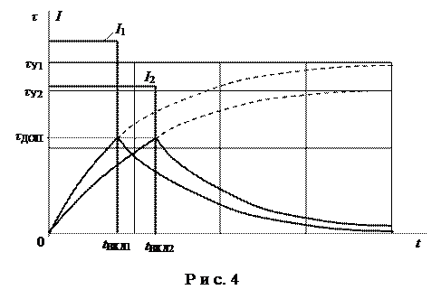 включения не успевает нагреться до установившейся температуры τУ, а затем на длительное время отключается и остывает до температуры окружающей среды. На рис. 4 приведены два графика нагрева для двух значений тока.